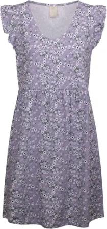 Damenkleid Gertha – bedrucktes Jersey, V-Ausschnitt, kurze Rüschenärmel, weiche Raffungen an der Taille, kurze Länge, 95 % Baumwolle, 5 % Elastan, Gelsomino-Druck, 42