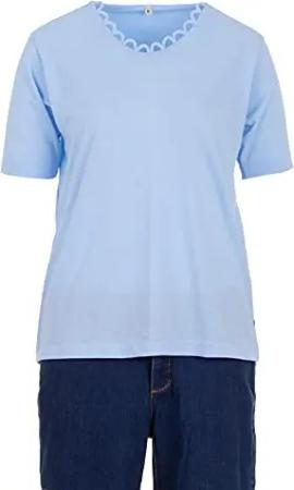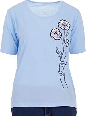 T-Shirt Damen Kurzarm Rundhals Blumenstickerei, Farbe:blau, Größe:L