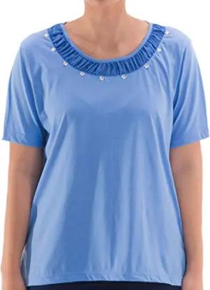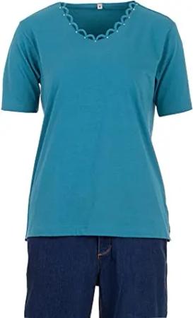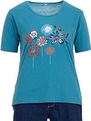 T-Shirt Kurzarm Rundhals Blume Stein Applikation, Farbe:Petrol, Größe:M