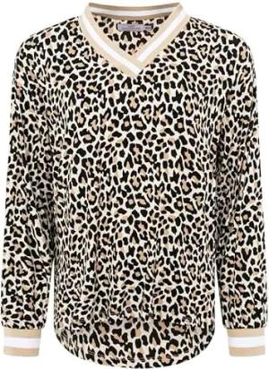 Damen Tunika Bluse, Leo-Muster, Langarm, Rundhals mit Quasten, Beige-Schwarz (DE/NL/SE/PL, Alphanumerisch, L, Regular, Regular, Leo Beige)