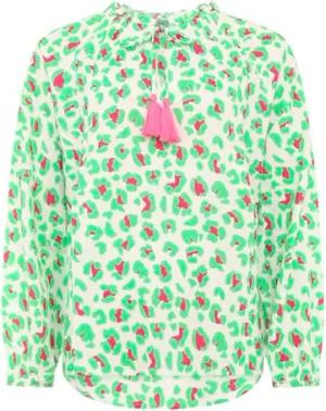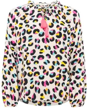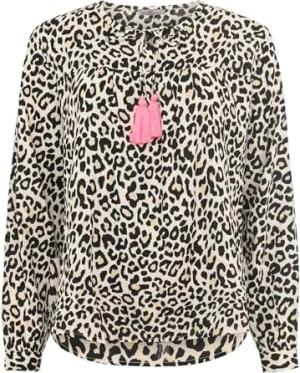 Schlupfbluse ""Crazy Leo"" mit buntem Leomotiv, Bindeband mit pinken Tasseln