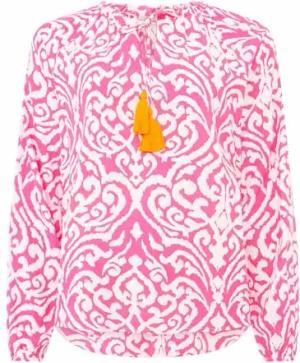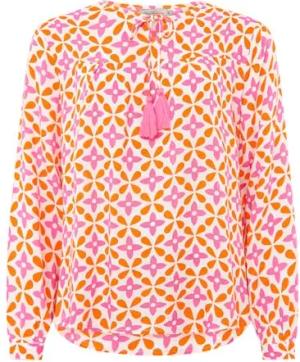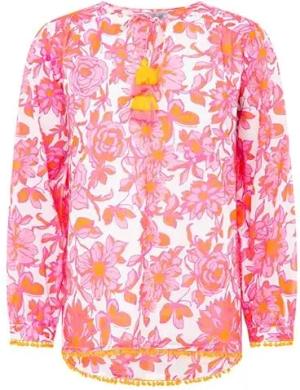 Damen Bluse Tunika mit Blumenmuster, Langarm mit Quasten, Rosa-Orange-Mint, Größe S