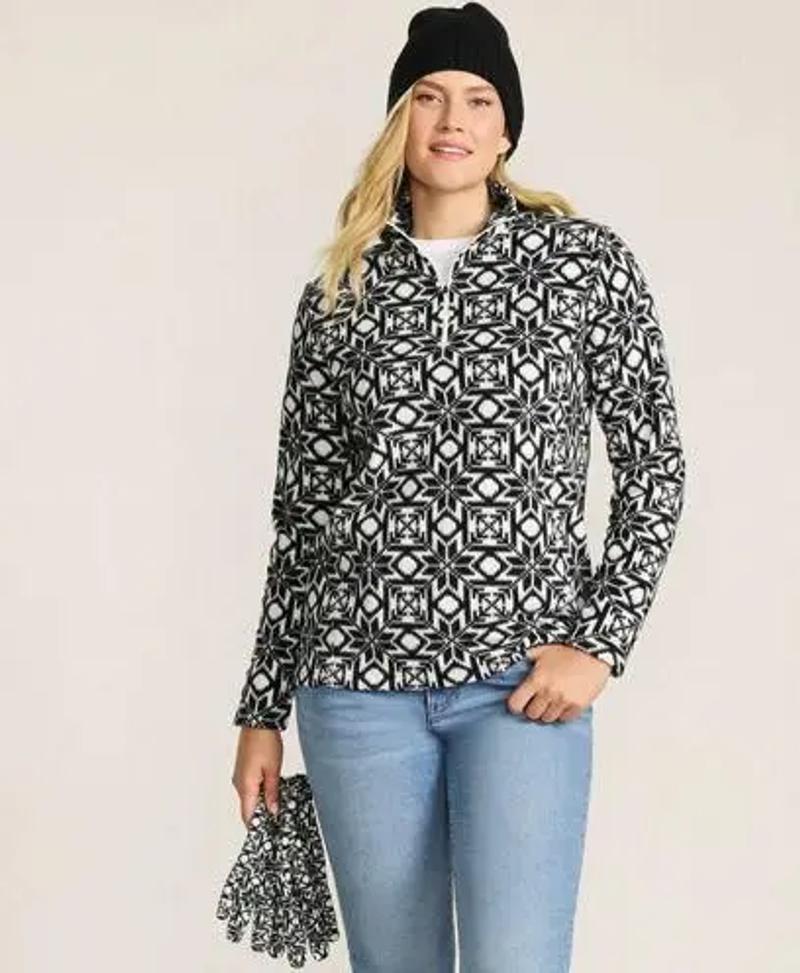 Gemusterter Fleece-Pullover mit Reißverschluss, Damen, Schwarz, Polyester, by Lands' End