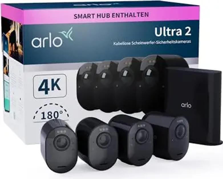 Arlo Ultra 2 Überwachungskamera Aussen WLAN, Kabellos, 4er Set, 4K UHD Qualitätsprodukt, 180° Sichtfeld, Spotlight, Farb-Nachtsicht, Bewegungsmelder, Alarm Sirene + mit Arlo Secure Testzeitraum
