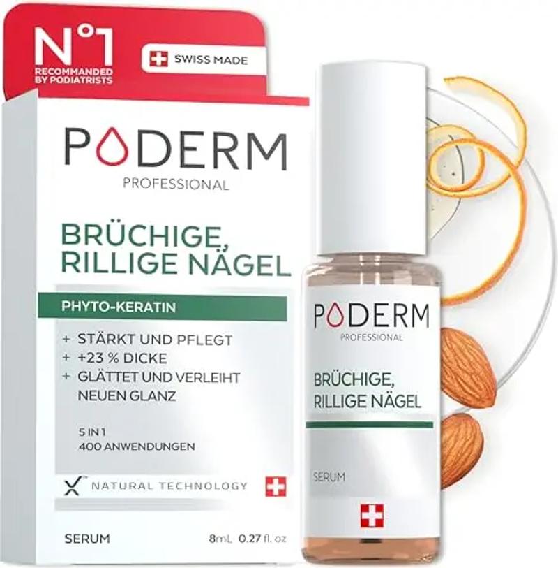 PODERM - BRÜCHIGE, GERILLTE UND STRAPAZIERTE NÄGEL | Rein pflanzliche Behandlung | Regeneriert, stärkt| Professionelle Fuß-/Handpflege | Einfach & schnell | Swiss Made, Farblos, 8 ml (1er Pack)